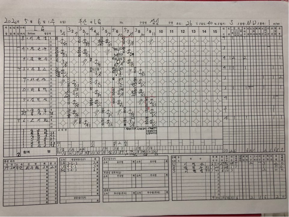 2020년 5월 6일 두산 vs LG 경기 기록지입니다.