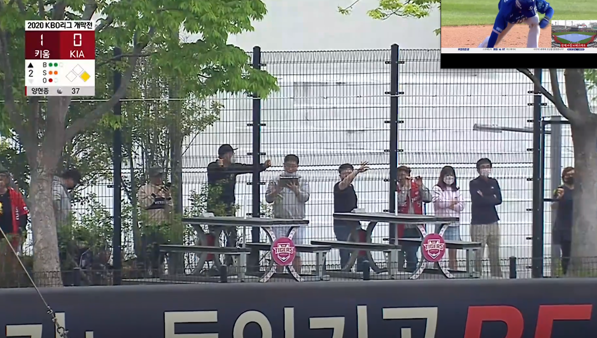 코로나19로 인한 무관중경기가 길어지면서 팬들사이에 어떻게든 야구를 직관하기 위한 진풍경이 펼쳐지는 중.