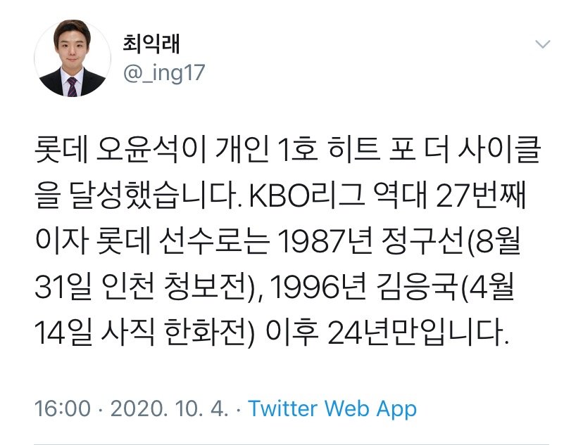 역대 통산 1호 만루홈런 포함 사이클링히트