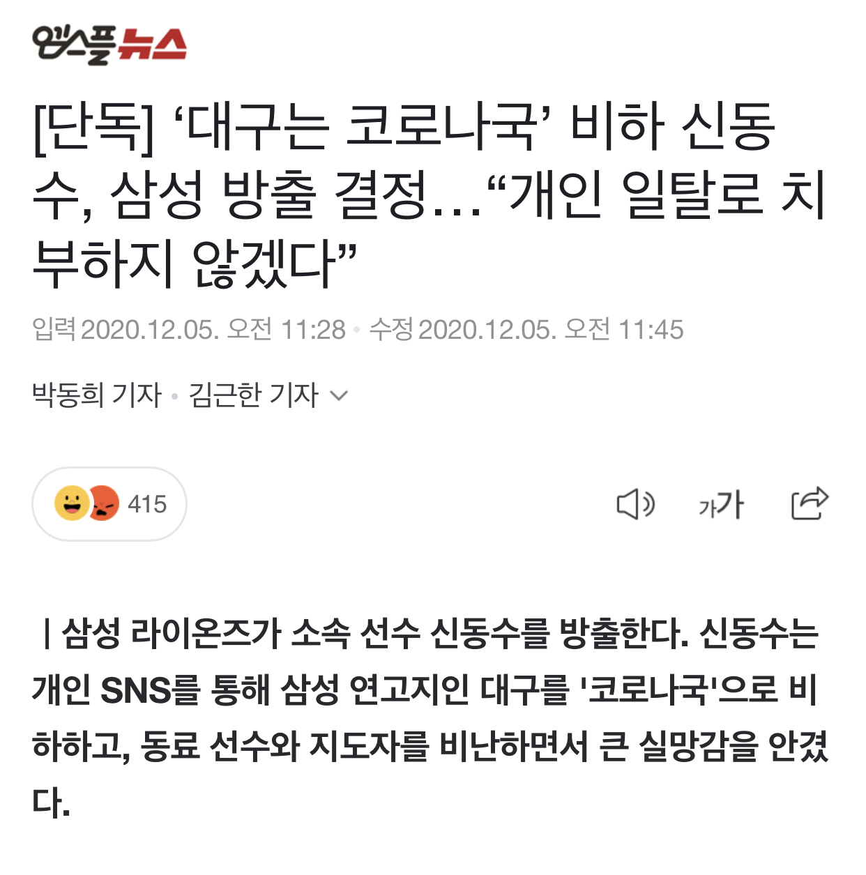 ㅣ삼성 라이온즈가 소속 선수 신동수를 방출한다. 신동수는 개인 SNS를 통해 삼성 연고지인 대구를 '코로나국'으로 비하하고, 동료 선수와 지도자를 비난하면서 큰 실망감을 안겼다. 삼성 라이온