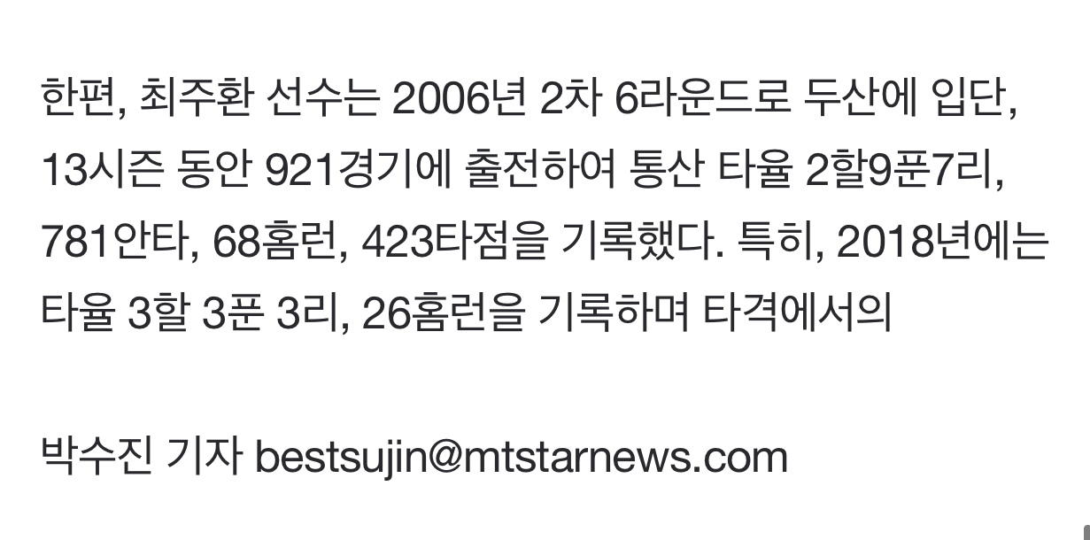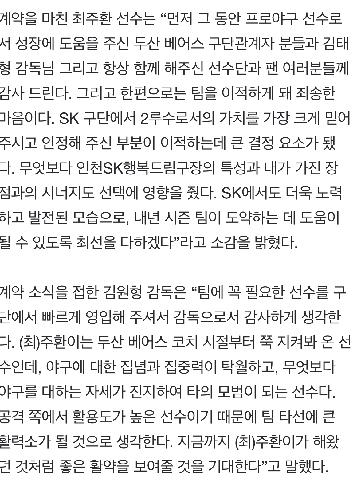 [오피셜] SK, 최주환과 4년 총액 42억원에 FA 계약 체결