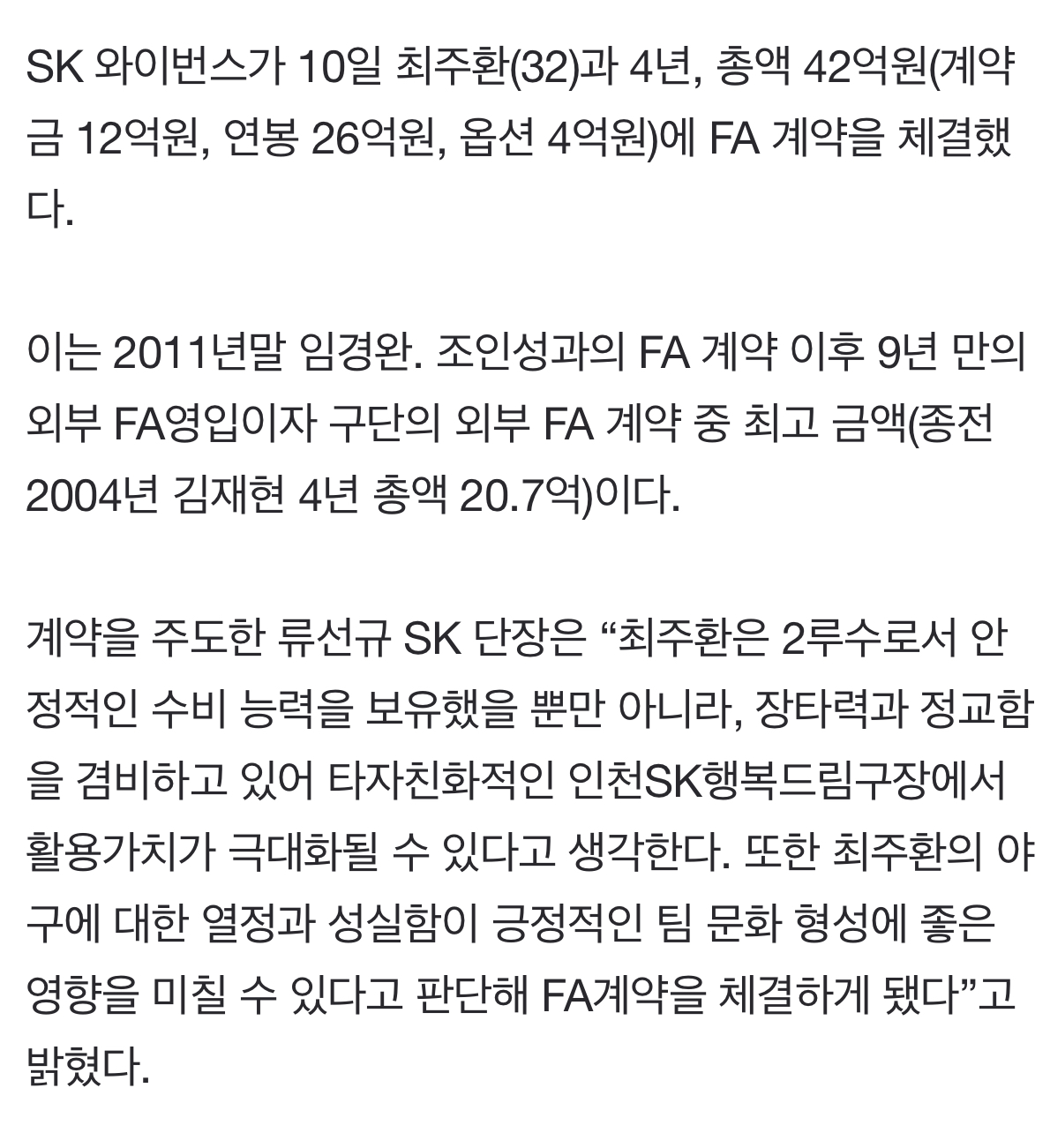 [스타뉴스 박수진 기자] SK 와이번스가 10일 최주환(32)과 4년, 총액 42억원(계약금 12억원, 연봉 26억원, 옵션 4억원)에 FA 계약을 체결했다. 이는 2011년말 임경완. 조인성과의 FA 계약 이후 9