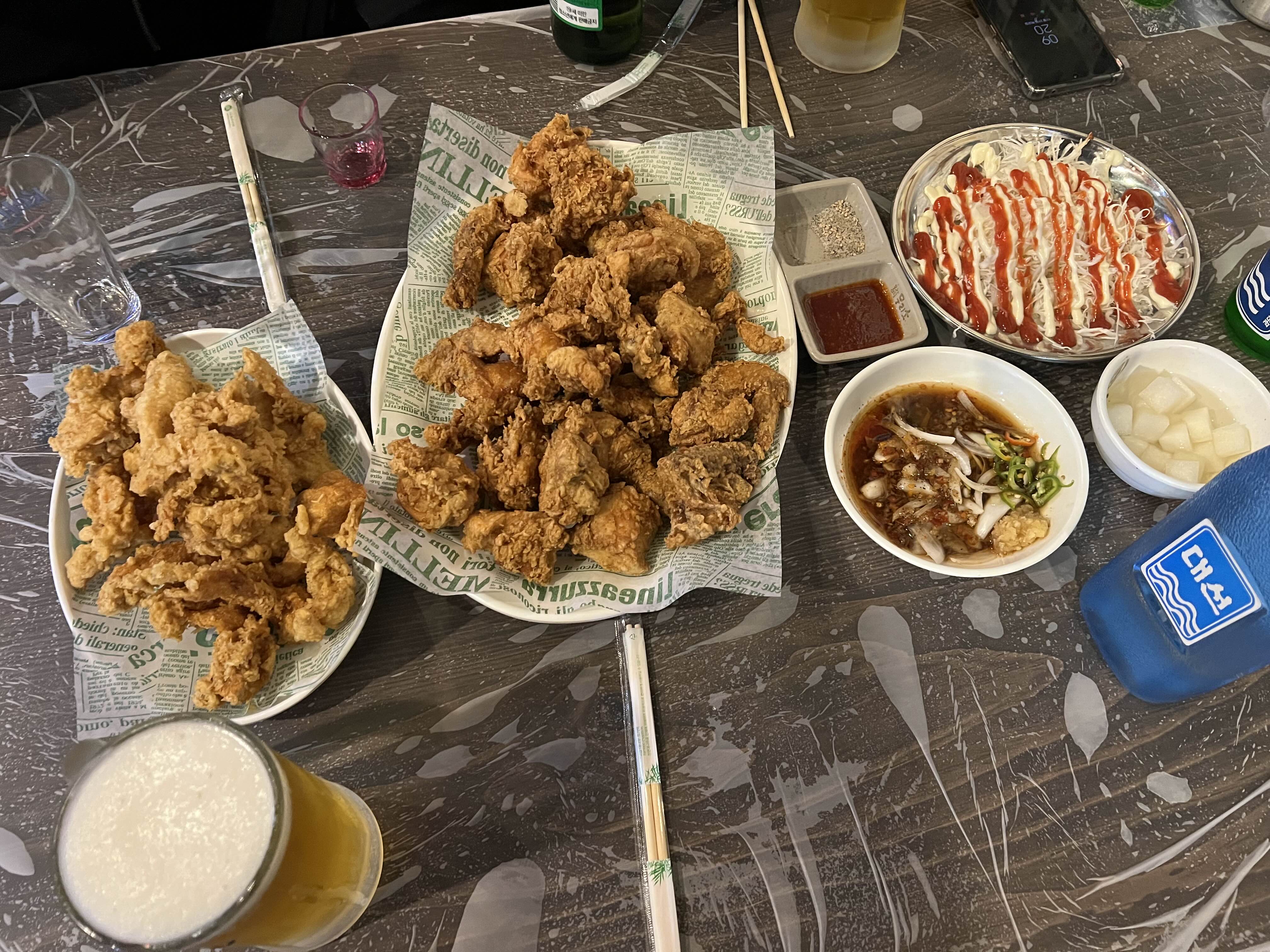 켄터키 치킨과 닭껍질 튀김을 씹으며
