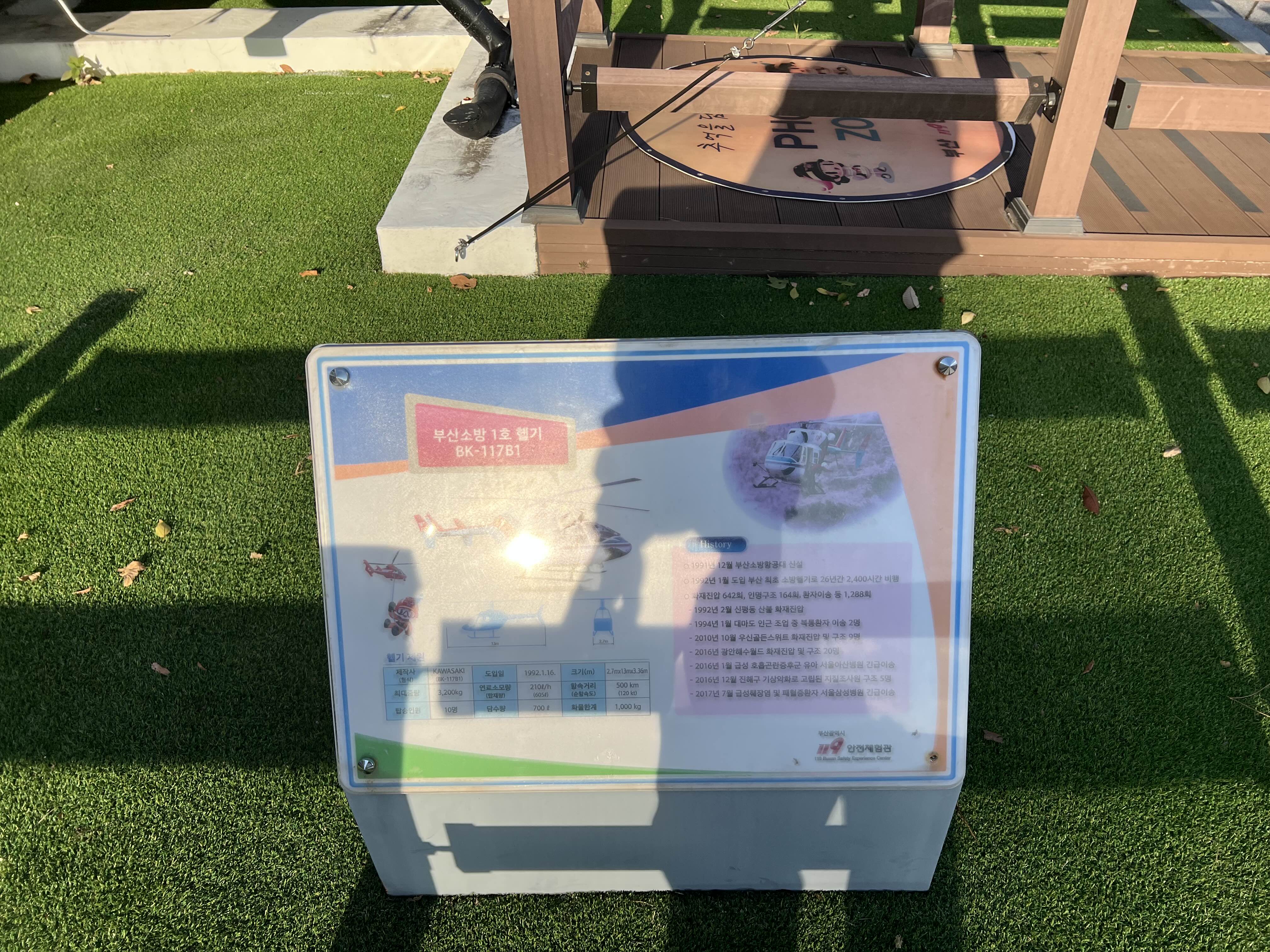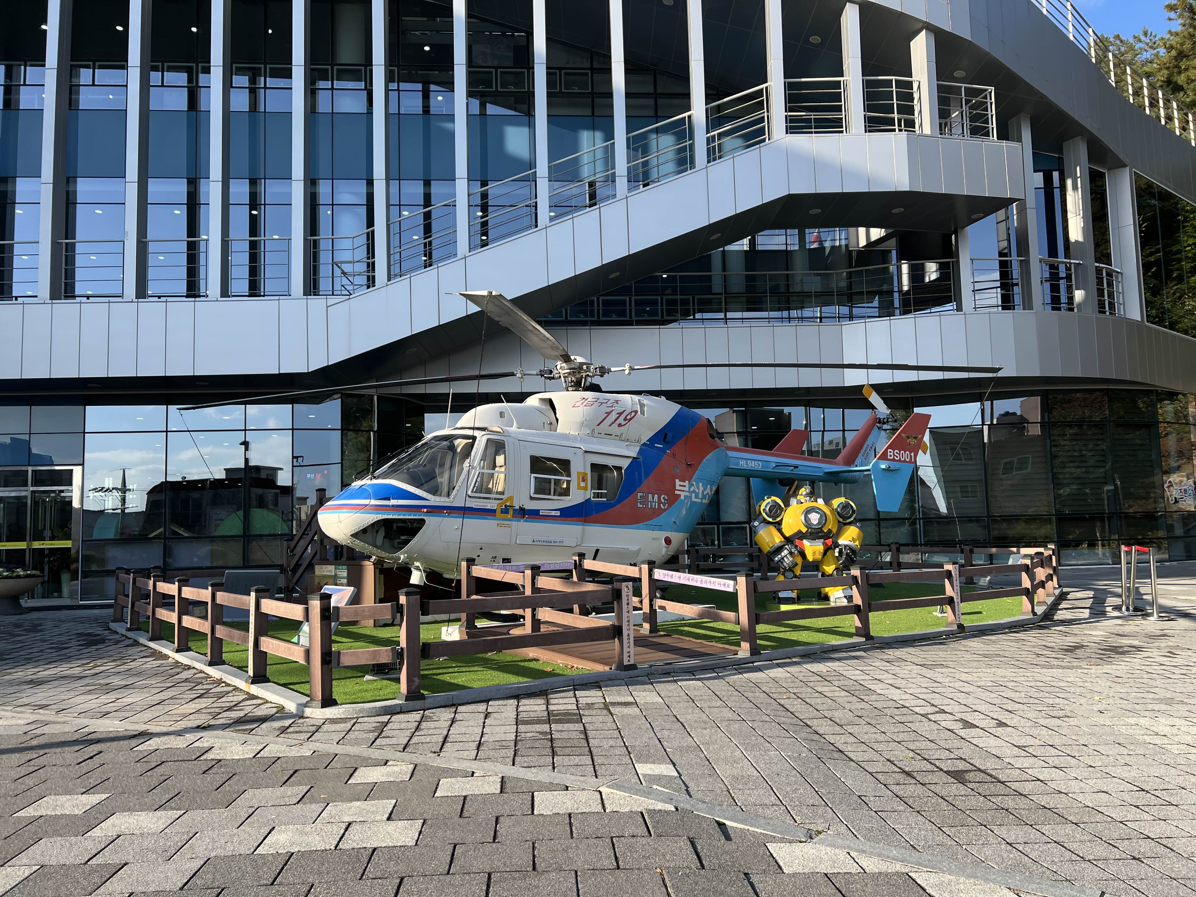 부산 119 체험관 정문에는 헬리콥터가 전시되어 있다