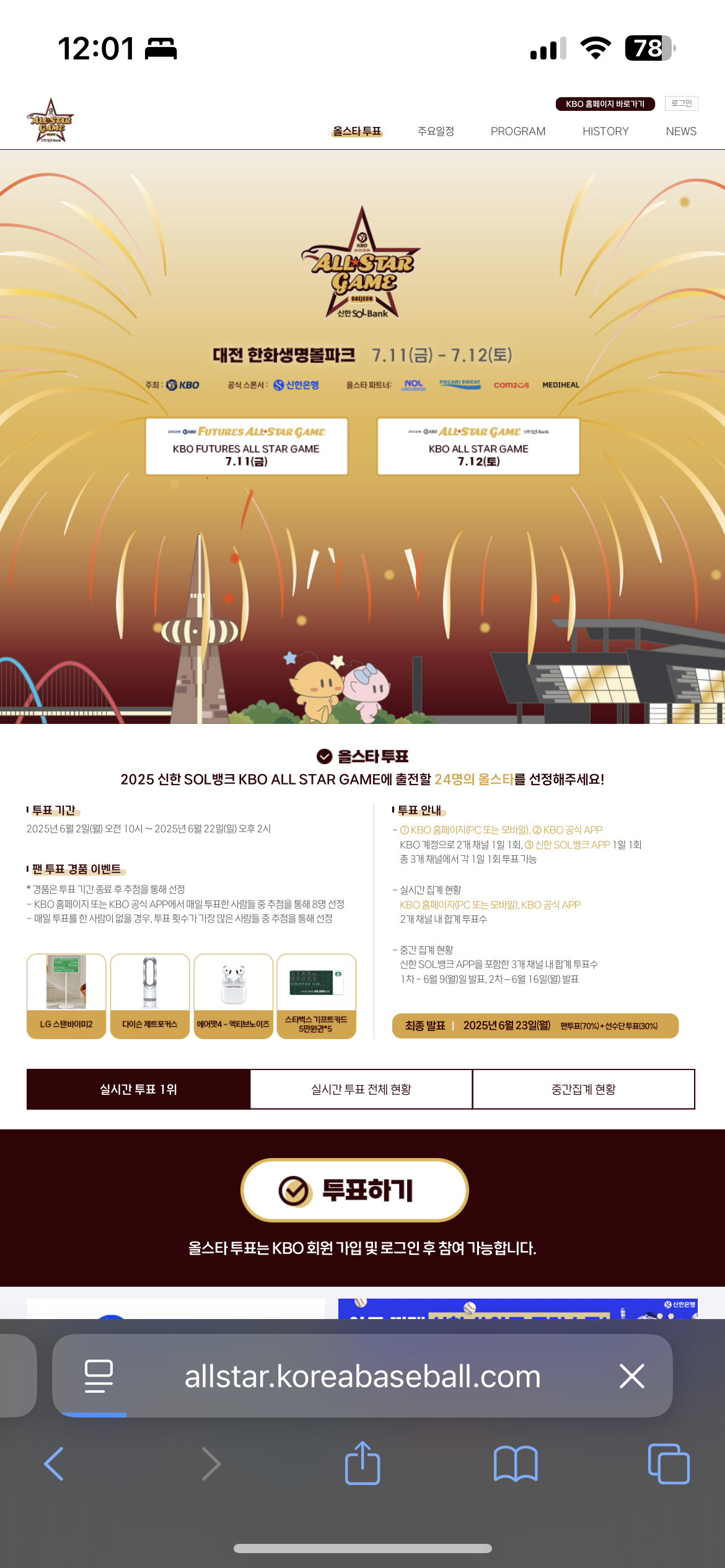 6월 2일 오전 10시부터 22일 오후 2시까지 KBO 올스타전 투표를 KBO 홈페이지, 어플, 신한은행 세 곳에서 진행 한다. 작년에 매일 참여하고도 못 받은 경품에 재도전 해보려고 했으나 첫날부터 홈페이지와 어플은 서버가 개판이라 참여조차 하지 못해서 화가나 글 남긴다.