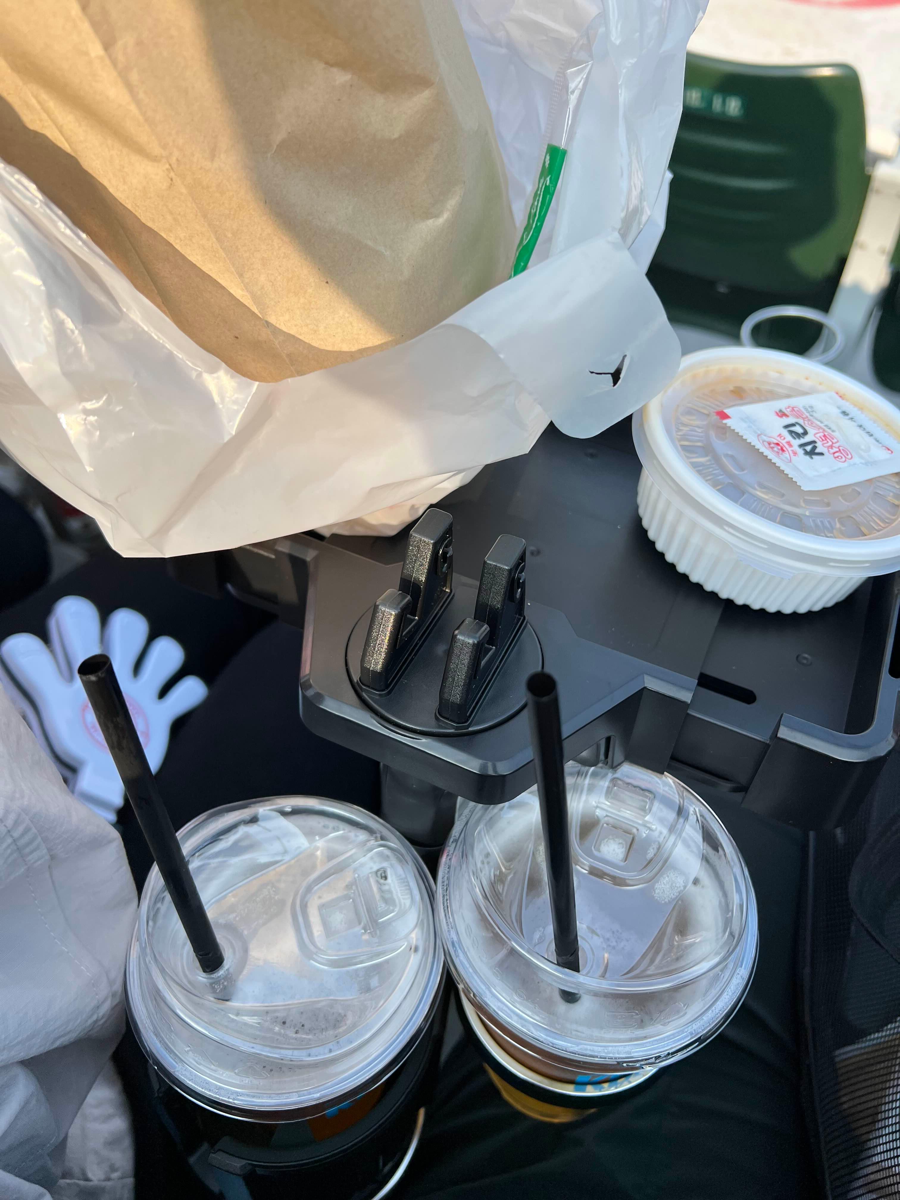 야구장 컵홀더에 차량용 컵홀더 테이블을 설치하고 치킨과 소스, 맥주 2잔을 장착했는데 아무리 흔들려도 끄떡없다.