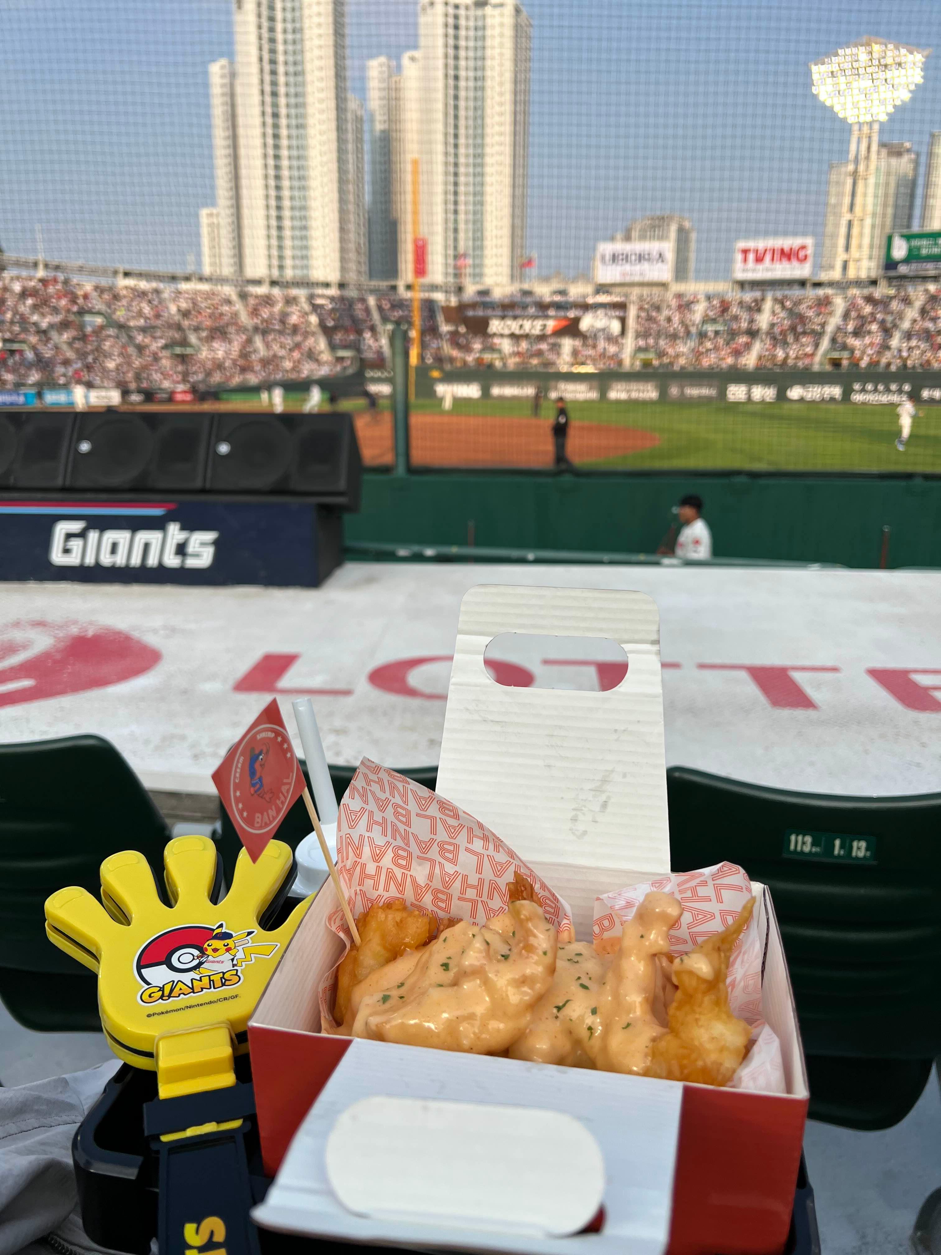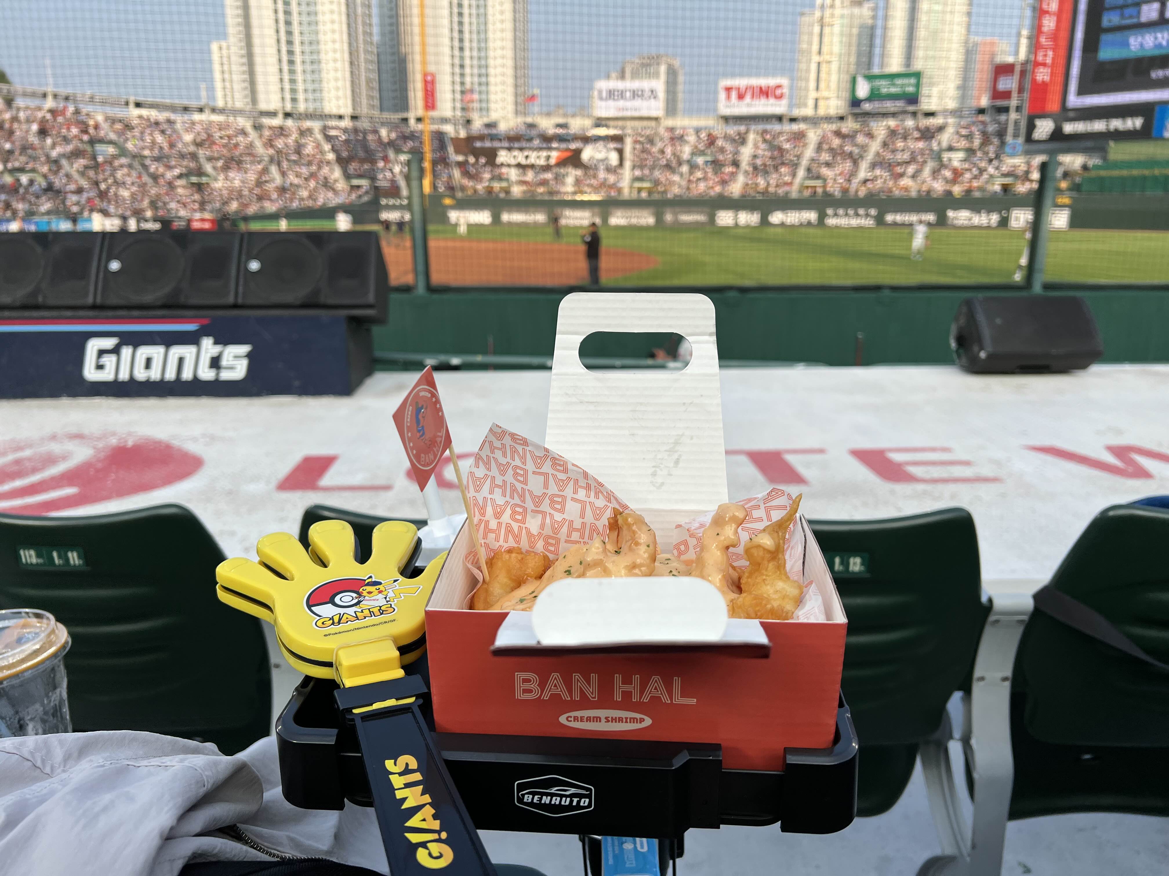 치킨을 먹은 후엔 짝짝이와 크림새우도 올려놓고 양손이 자유롭게 야구관람을 할 수 있었다.